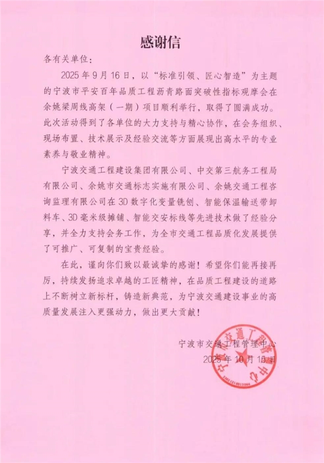 近日,中交三航局餘姚梁周線高架項目收到寧波市交通工程管理中心的感謝信,以表彰該項目在3D數位化變數銑刨、智慧保溫輸送帶卸料車、3D毫米級攤鋪等先進技術的經驗分享,為全市交通工程品質化發展提供了可推廣、可複製的寶貴經驗。