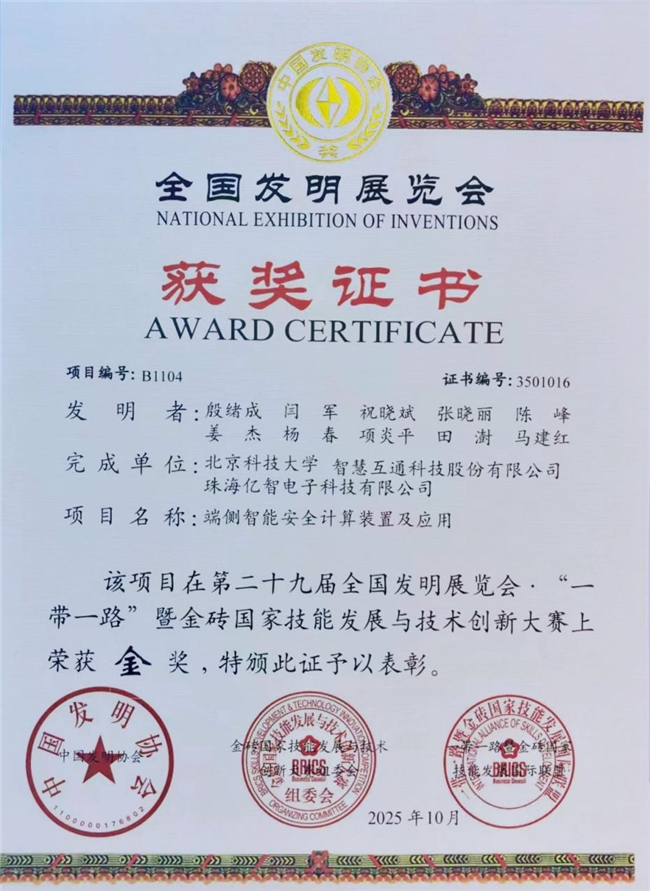 近日,由中國發明協會主辦的第二十九屆全國發明展覽會與第六屆中國國際數字經濟博覽會同期在河北省石家莊國際會展中心舉行。憑藉高精度AI+交通前沿技術的創新優勢,以及突出的經濟效益與社會效益,智慧互通(AICT)聯合北京科技大學、珠海億智電子科技有限公司申報的“端側智能安全計算裝置及應用”項目獲得本屆展會金獎,受到眾多評委及與會嘉賓的認可。
