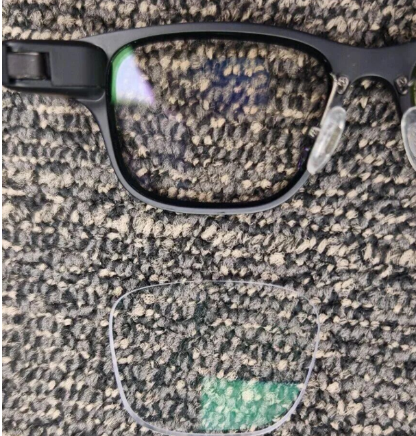 一體化貼合的鏡片,採用的是“一面平、一面凹”的設計——平面用於光波導顯示,凹面用於矯正近視。