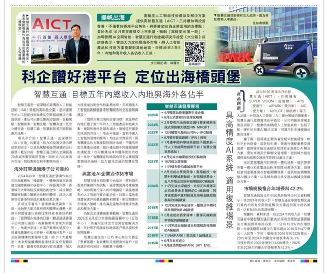 近日,香港知名媒體《大公報》對智慧互通(AICT)CEO項炎平博士進行了專訪。作為去年特區政府的重點引進企業之一,項炎平博士表示,公司正持續加碼投資香港,不僅看好香港平臺角色,將香港定位為企業出海的支撐點,會加大力度拓展海外市場,將高精度人工智能產品和技術方案複製到其他地區,賦能千行百業。