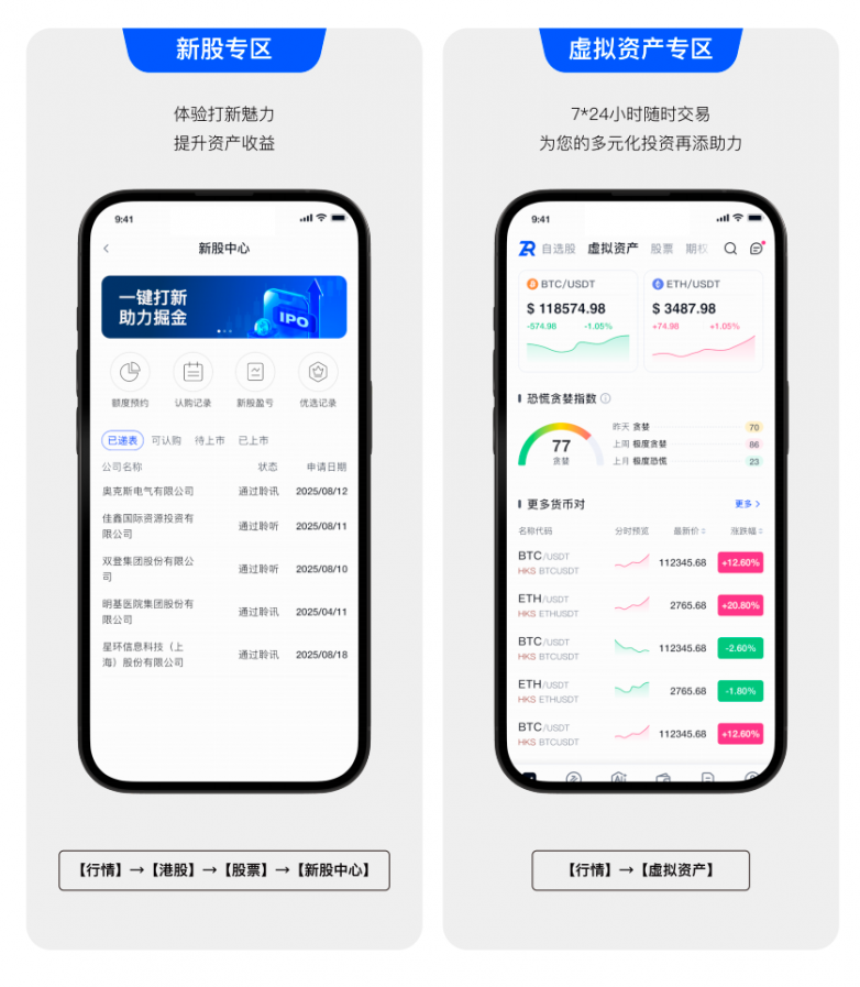 用戶無需將加密貨幣兌換為法幣,只需將手中的 BTC、ETH 等加密貨幣直接充值至平台,即可無縫轉換為交易資金,直通港股、美股市場。這種「幣進」模式,省去了所有中間環節的摩擦成本與時間損耗。