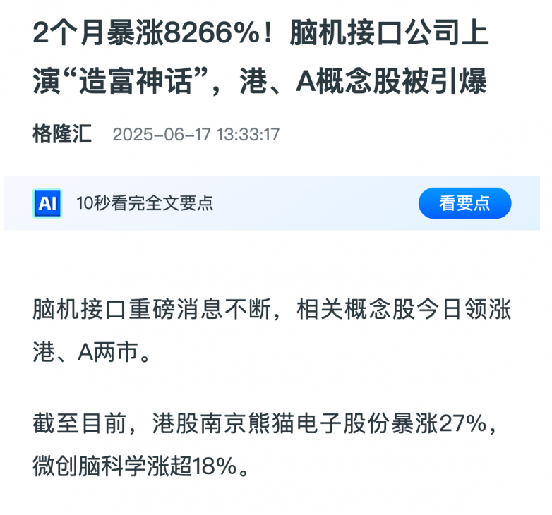 朋友圈裡,一張來自傳統投資圈好友的截圖卻格外刺眼:腦機接口概念持續拉升,美股「腦機接口」概念股腦再生科技盤中一度漲超 410%,引發了超過 10 次的臨停,兩月漲幅更是達到了驚人的 8266%。