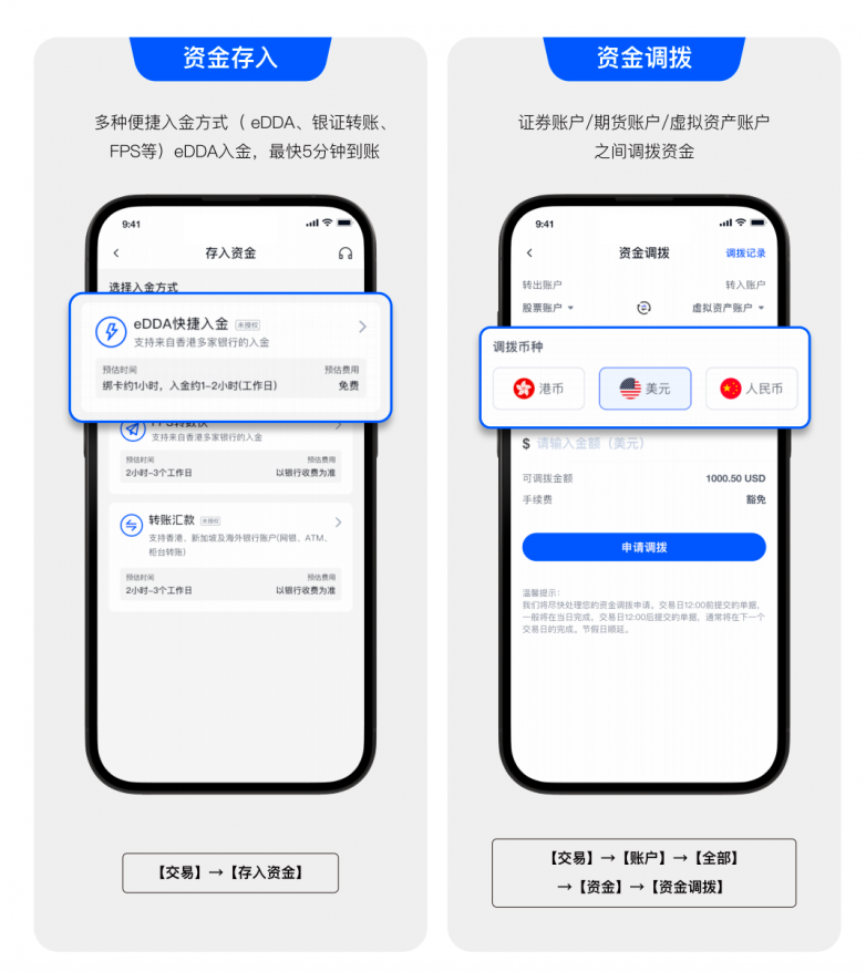 下載卓銳證券 App「ZR」後,操作相當絲滑。在【交易】→【存入資金】中選擇「虛擬資產充值」,螢幕上清晰地展示了支持的幣種:USDT、BTC、ETH……他將 10 萬 USDT 從自己的交易所錢包轉入指定的充值地址。不到 5 分鐘,App 推送通知——資金已到賬,並可一鍵兌換為港幣或美元的交易額度。