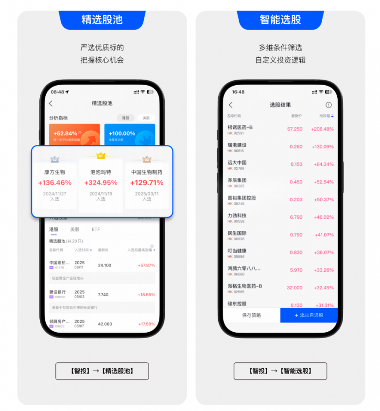 他打開了 App 中的【精選股池】和【智慧選股】功能,嚴選出了當前市場的優質標的,並可根據「熱門概念」、「高成長預期」、「低估值」等多維條件進行篩選。